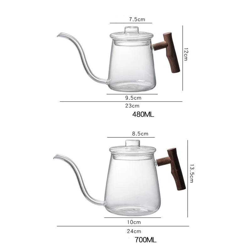 Cette bouilloire col de cygne en verre est proposée en deux capacités, 480 ml et 700 ml, pour s’adapter aux préparations du quotidien comme aux extractions manuelles type slow coffee. Son format permet de chauffer et de verser la quantité nécessaire sans surplus.
